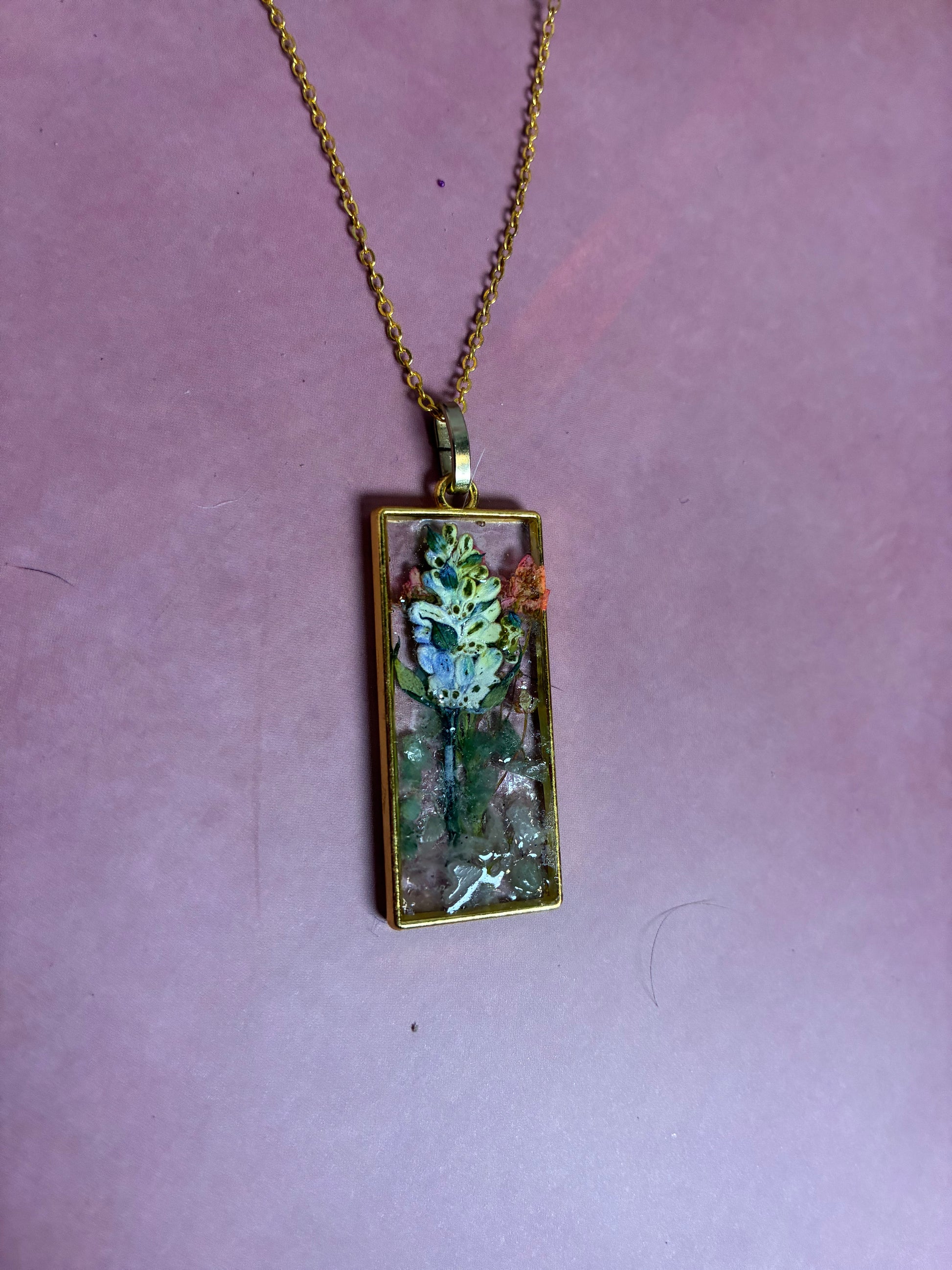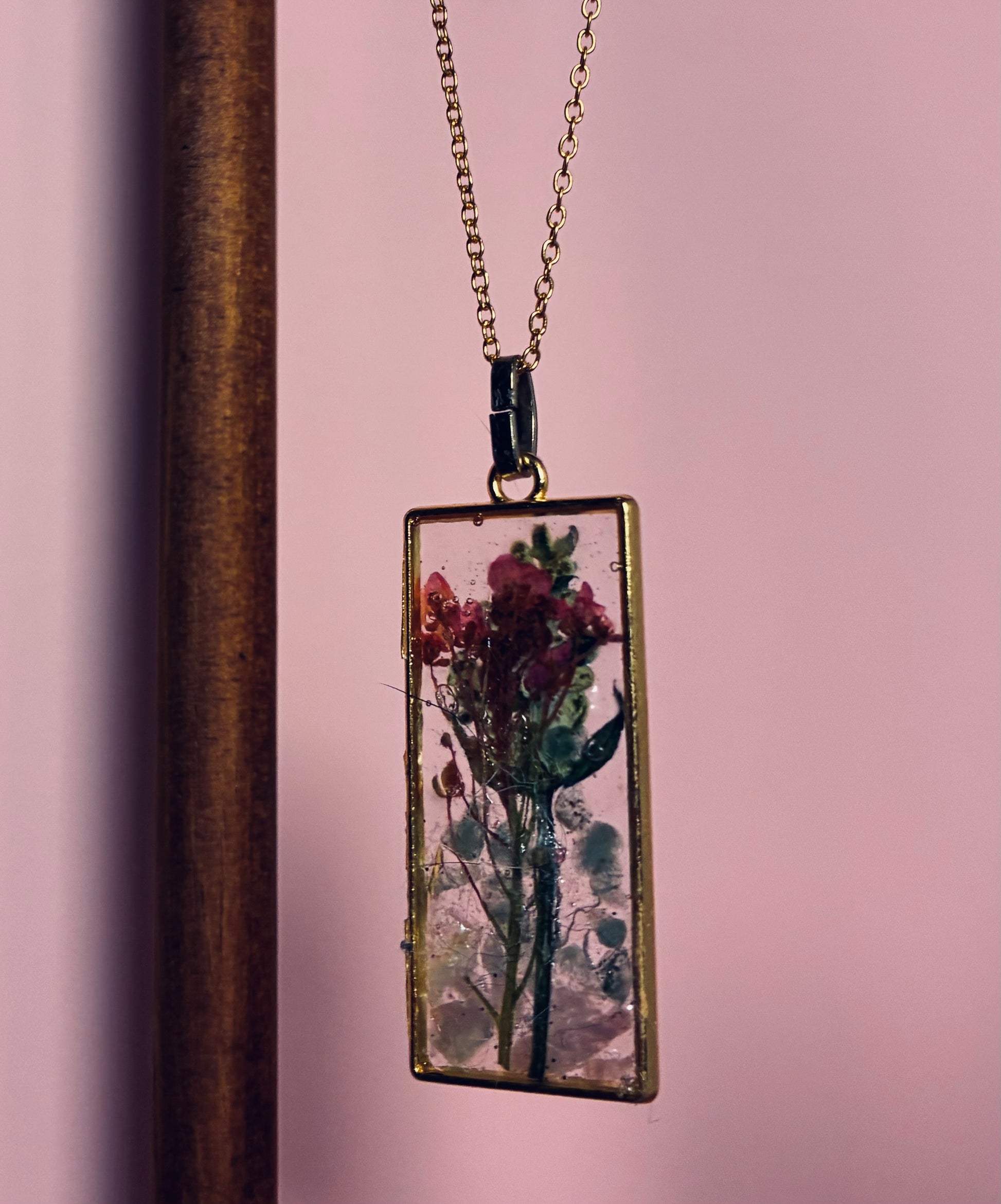 This elegant pendant features real pressed botanicals encased in crystal-clear resin, framed in a gold-tone rectangular bezel. Each necklace is one-of-a-kind, making it a perfect gift or statement piece.